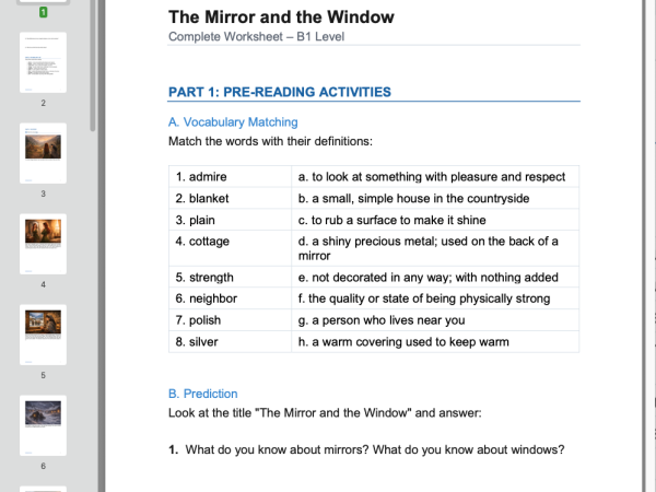 Bring meaningful discussion and thorough language practice to your B1 classroom with this story-based worksheet pack. Built around an original fable about two sisters — one who looks only at…
